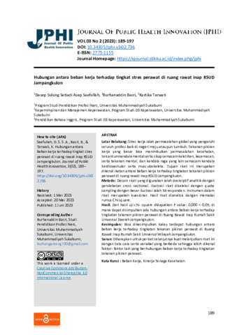 Dasep, Sulung Setiadi Asep Saefullah and Burhanuddin, Basri and Kartika, Tarwati (2023) Hubungan antara beban kerja terhadap tingkat stres perawat di ruang rawat inap RSUD Jampangkulon. Journal of Public Health Innovation (JPHI), 3 (2): 12. pp. 189-197. ISSN 2775-1155