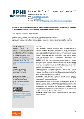 Rudi, Sugiarto and Tri, Utami and Hadi, Abdillah (2023) Hubungan mekanisme koping dengan tingkat kecemasan pasien pre operasi sectio caesarea di ruang kamar operasi RSUD Jampang Kulon Kabupaten Sukabumi. Journal of Public Health Innovation (JPHI), 3 (2): 15. pp. 214-222. ISSN 2775-1155