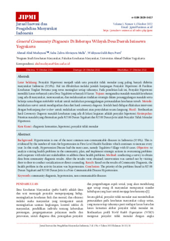 Ahmad, Ahid Mudayana and Salsa, Zahva Ahviayata Malla and Widiyana, Galih Bayu Putri (2022) General community diagnosis di beberapa wilayah Desa Daerah Istimewa Yogyakarta. Jurnal Inovasi dan Pengabdian Masyarakat Indonesia, 1 (4): 7. pp. 28-32. ISSN 2829-5617