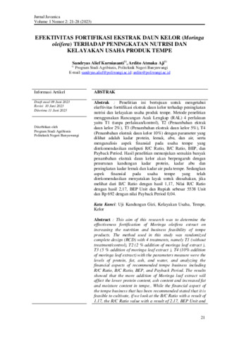 Sandryas, Alief Kurniasanti and Ardito, Atmaka Aji (2023) Efektivitas fortifikasi ekstrak daun kelor (Moringa oleifera) terhadap peningkatan nutrisi dan kelayakan usaha produk tempe di Kabupaten Banyuwangi. Jurnal Javanica: Jurnal Terapan Agribisnis, 2 (1): 3. pp. 21-28. ISSN 2963-8186