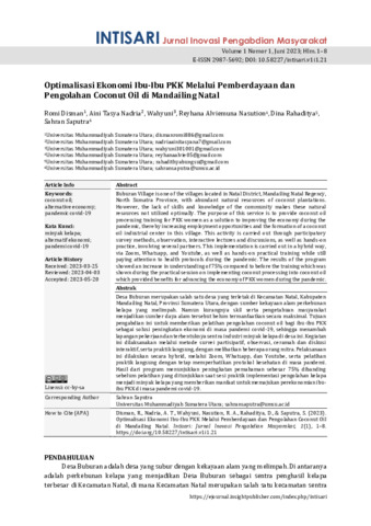 Romi, Disman and Aini, Tasya Nadria and Wahyuni, Wahyuni and Reyhana, Alviemuna Nasution and Dina, Rahaditya and Sahran, Saputra (2023) Optimalisasi ekonomi ibu-ibu PKK melalui pemberdayaan dan pengolahan coconut oil di Mandailing Natal. Intisari: Jurnal Inovasi Pengabdian Masyarakat, 1 (1): 1. pp. 1-8. ISSN 2987-5692