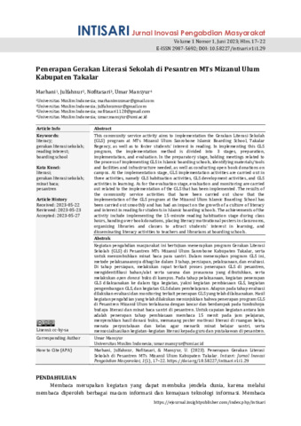 Ary Marhani, Marhani and Julfahnur, Julfahnur and Nofitasari, Nofitasari and Umar, Mansyur (2023) Penerapan gerakan literasi sekolah di Pesantren MTs Mizanul Ulum Kabupaten Takalar. Intisari: Jurnal Inovasi Pengabdian Masyarakat, 1 (1): 3. pp. 17-22. ISSN 2987-5692