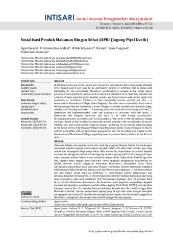 Agusriyanto, Agusriyanto and R., Gymnastiar Ardani and Wilda, Wijayanti and Nusrah, Nusrah and Irma, Yangsar and Rizkariani, Sulaiman (2023) Sosialisasi produk makanan ringan sehat JAPRI (Jagung Pipil Gurih). Intisari: Jurnal Inovasi Pengabdian Masyarakat, 1 (1): 7. pp. 47-52. ISSN 2987-5692