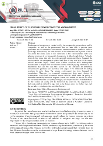 Yogi, Prasetyo and Alfalachu, Indiantone Siaoro and Aries, Isnandar (2022) Legal ethics of sustainable environmental management. Protection: Journal of Land and Environmental Law, 1 (2): 7. pp. 133-138. ISSN 2830-4675