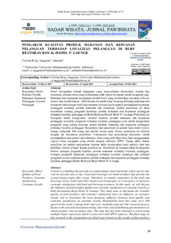 Cristian, Rizqi Anggraini and Juhanda, Juhanda (2023) Pengaruh kualitas produk makanan dan kepuasan pelanggan terhadap loyalitas pelanggan di Rubyrestoran Royal Hotel n’ Lounge. Sadar Wisata: Jurnal Pariwisata, 6 (1): 3. pp. 18-23. ISSN 1858-0114