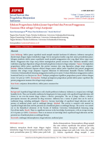 Kanti, Ratnaningrum and Maya, Dian Rakhmawatie and Nanik, Marfu’ati (2023) Edukasi pengetahuan infeksi jamur superfisial dan potensi penggunaan tanaman obat sebagai terapi antijamur. Jurnal Inovasi dan Pengabdian Masyarakat Indonesia, 2 (1): 1. pp. 1-4. ISSN 2829-5617