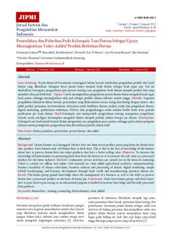 Fatmasari, Sukesti and Haerudin, Haerudin and Hardiwinoto, Hardiwinoto and Alwiyah, Alwiyah and Ery, Wibowo and Ayu, Noviani Hanum and Ida, Kristiana (2023) Penyuluhan dan pelatihan pada kelompok tani durian sebagai upaya meningkatkan value-added produk berbahan durian. Jurnal Inovasi dan Pengabdian Masyarakat Indonesia, 2 (1): 8. pp. 5-8. ISSN 2829-5617