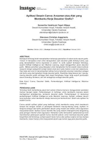 Samantha, Handriyani Teguh Wijaya and Stevanus, Christian Anggrianto (2023) Aplikasi desain canva: Ancaman atau alat yang membantu kerja desainer grafis? Imatype: Journal of Graphic Design Studies, 2 (1): 1. pp. 1-8. ISSN 2828-4151