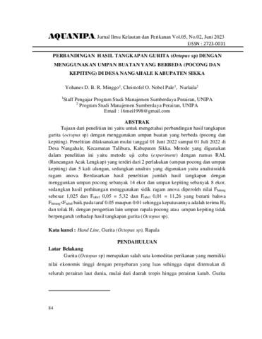 Yohanes, D. B. R. Minggo and Christofel, O. Nobel Pale and Nurlaila, Nurlaila (2022) Perbandingan hasil tangkapan gurita (Octopus sp.) dengan menggunakan umpan buatan yang berbeda (pocong dan kepiting) di Desa Nangahale Kabupaten Sikka. Aquanipa : Jurnal Ilmu Kelautan dan Perikanan, 5 (2): 6. pp. 70-83. ISSN 2723-0031