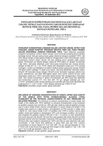 Susilowati, Sri Rinanti and Herlani, Ratmi and Widiyati, Sri (2012) PENGARUH KONSENTRASI URANIUM DALAM LARUTAN URANIL NITRAT DAN PANJANG JARUM PENETES TERHADAP BENTUK FISIK GEL PADA PROSES GELASI EKSTERNAL DENGAN PENSTABIL THFA. In: PENELITIAN DAN PENGELOLAAN PERANGKAT NUKLIR, 26 September 2012, Yogykarta.