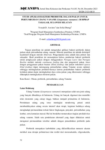 Yoseph, D. Aswinto and Sofia, Dhengi (2023) Studi aplikasi bakteri probiotik dalam pakan untuk pertumbuhan udang vaname (Litopenaeus vannamei ) di BPBAP Takalar, Sulawesi Selatan. Aquanipa : Jurnal Ilmu Kelautan dan Perikanan, 5 (4): 7. pp. 72-84. ISSN 2723-0031