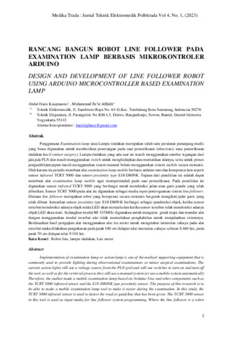 Abdul, Haris Kuspranoto and Muhammad, Fa’iz Alfatih (2023) Rancang bangun robot line follower pada examination lamp berbasis mikrokontroler arduino. Medika Trada: Jurnal Teknik Elektromedik Polbitrada, 4 (1): 1. pp. 1-7. ISSN 2829-453X