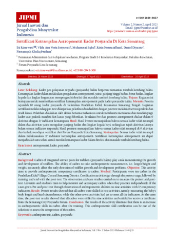Eti, Rimawati and Vilda, Ana Veria Setyawati and Muhammad, Iqbal and Ririn, Nurmandhani and Daniel, Diyanto and Firmansyah, Kholiq Pradana (2023) Sertifikasi ketrampilan antropometri kader Posyandu di Kota Semarang. Jurnal Inovasi dan Pengabdian Masyarakat Indonesia, 2 (2): 9. pp. 35-40. ISSN 2829-5617