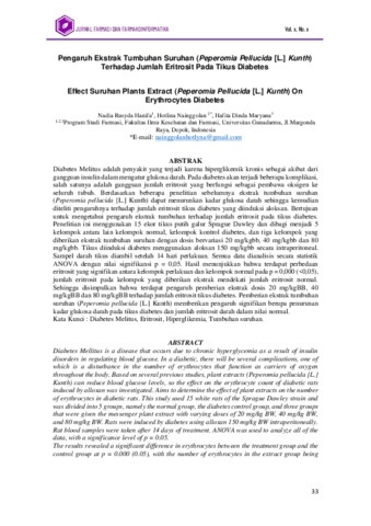 Nadia, Rusyda Hanifa and Hotlina, Nainggolan and Hafita, Dinda Maryana (2023) Pengaruh ekstrak tumbuhan suruhan (Peperomia Pellucida [L.] Kunth) terhadap jumlah eritrosit pada tikus diabetes. Jurnal Farmasi dan Farmakoinformatika, 1 (1): 3. pp. 33-41. ISSN 2987-4718