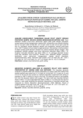 PENYIAPAN SAMPEL SECARA ASHING MENGGUNAKAN METODA AAS. Telah dilakukan analisis unsur-unsur takmurnian dalam pelet grafit dengan penyiapan sampel secara ashing menggunakan metoda AAS, konsentrasi unsur standar divariasi dari 0,1-0,5 ppm untuk Cd dan Mn, 0,2-1,0 ppm untuk Cu dan 0,5-2,5 ppm untuk Ni dan Fe. Penyiapan sampel dilakukan dengan cara pengabuan (ashing) grafit pada suhu 1200 oC selama 4,5 jam dalam tungku pemanas. Cara ashing ini semua karbon di dalam sampel grafit berubah menjadi CO karena bereaksi dengan oksigen. Sisa