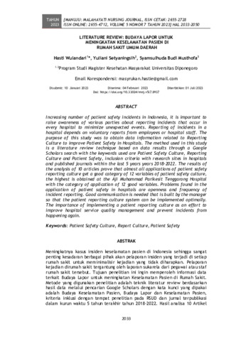 Hasti, Wulandari and Yuliani, Setyaningsih and Syamsulhuda, Budi Musthofa (2023) Literature review: Budaya lapor untuk meningkatan keselamatan pasien di rumah sakit umum daerah. Manuju : Malahayati Nursing Journal, 5 (7): 4. pp. 2033-2050. ISSN 2655-2728