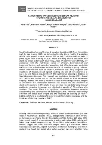 Fera, The and Marhaeni, Hasan and Kiky, Frederik Rompis and Daisy, Aurelia and Andri, Imbar (2023) Faktor resiko yang berhubungan dengan kejadian stunting pada balita di Kabupaten Halmahera Barat. Manuju : Malahayati Nursing Journal, 5 (7): 5. pp. 2051-2063. ISSN 2655-2728