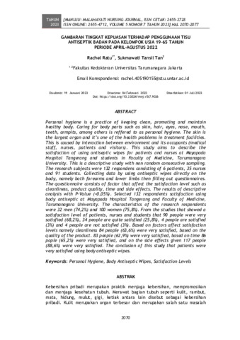 Rachel, Ratu and Sukmawati, Tansil Tan (2023) Gambaran tingkat kepuasan terhadap penggunaan tisu antiseptik badan pada kelompok usia 19-65 tahun periode April-Agustus 2022. Manuju : Malahayati Nursing Journal, 5 (7): 7. pp. 2070-2077. ISSN 2655-2728