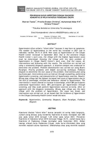 Sherren, Tanzia and Priscilla, Elnatan Christina and Muhammad, Akbar R N and Silviana, Tirtasari (2023) Penurunan kasus hipertensi dengan diagnosis komunitas di Wilayah Kerja Puskesmas Cikupa. Manuju : Malahayati Nursing Journal, 5 (7): 8. pp. 2078-2094. ISSN 2655-2728