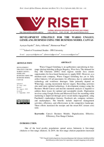 Ayutyas, Sayekti and Selvy, Alfionita and Hermawan, Wana (2023) Development strategy for the Warso Unggul Gemilang business using the business S model canvas. Riset: Jurnal Aplikasi Ekonomi Akuntansi Dan Bisnis, 5 (2): 8. pp. 104-116. ISSN 2797-4057
