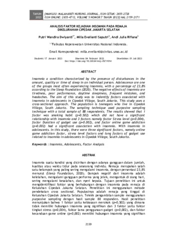 Putri, Wandira Dwiyanti and Milla, Evelianti Saputri and Andi, Julia Rifiana (2023) Analisis faktor kejadian insomnia pada remaja di Kelurahan Cipedak Jakarta Selatan. Manuju : Malahayati Nursing Journal, 5 (7): 15. pp. 2159-2171. ISSN 2655-2728