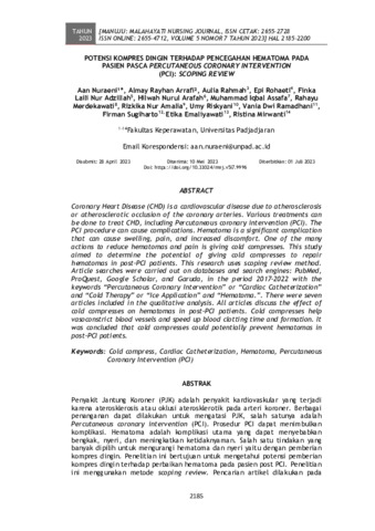 Aan, Nuraeni and Almay, Rayhan Arrafi and Aulia, Rahmah and Epi, Rohaeti and Finka, Laili Nur Adzillah and Hilwah, Nurul Arafah and Muhammad, Iqbal Assafa and Rahayu, Merdekawati and Rizkika, Nur Amalia and Umy, Riskyani and Vania, Dwi Ramadhani and Firman, Sugiharto and Etika, Emaliyawati and Ristina, Mirwanti (2023) Potensi kompres dingin terhadap pencegahan hematoma pada pasien pasca Percutaneous Coronary Intervention (PCI): Scoping review. Manuju : Malahayati Nursing Journal, 5 (7): 17. pp. 2185-2200. ISSN 2655-2728