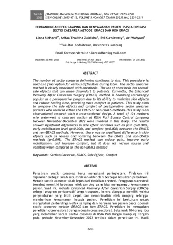 Liana, Sidharti and Arifaa, Thalitha Zuleikha and Evi, Kurniawaty and Ari, Wahyuni (2023) Perbandingan efek samping dan kenyamanan pasien pasca operasi sectio caesarea metode eracs dan non eracs. Manuju : Malahayati Nursing Journal, 5 (7): 18. pp. 2201-2211. ISSN 2655-2728
