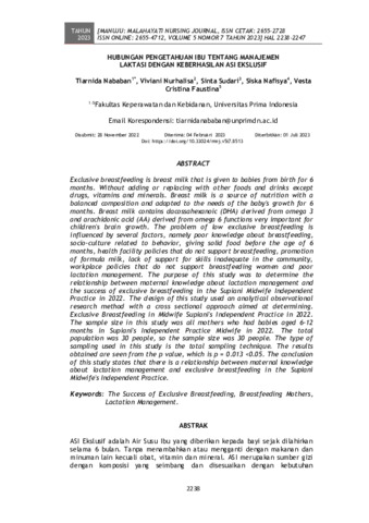 Tiarnida, Nababan and Viviani, Nurhalisa and Sinta, Sudari and Siska, Nafisya and Vesta, Cristina Faustina (2023) Hubungan pengetahuan ibu tentang manajemen laktasi dengan keberhasilan ASI ekslusif. Manuju : Malahayati Nursing Journal, 5 (7): 22. pp. 2238-2247. ISSN 2655-2728