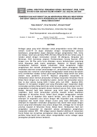 Veza, Azteria and Erna, Veronika and Ahmad, Irfandi (2023) Pemberdayaan masyarakat dalam menerapkan perilaku hidup bersih dan sehat sebagai upaya pengendalian vektor DBD di Kelurahan Kranji Bekasi Barat. Jurnal Kreativitas Pengabdian kepada Masyarakat, 6 (7): 5. pp. 2621-2630. ISSN 2615-0921