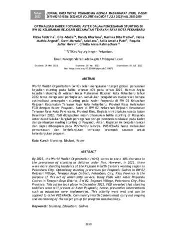 Rizka, Febtrina and Gita, Adelia and Dendy, Kharisna and Mariska, Dita Pratiwi and Helsa, Muthia Angesti and Dewi, Marsela and Adeliana, Adeliana and Adila, Amelia Putri and Paquita, Jafier Herrin and Chintia, Anisa Rahmadhani (2023) Optimalisasi kader Posyandu Aster dalam pencegahan stunting di RW 02 Kelurahan Rejosari Kecamatan Tenayan Raya Kota Pekanbaru. Jurnal Kreativitas Pengabdian kepada Masyarakat, 6 (7): 25. pp. 2850-2859. ISSN 2615-0921