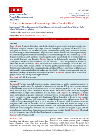 Retno, Kusniati and Merry, Tiyas Anggraini and Nada, Nikmaturrizqi and Karomah, Rizky Sofiatun and Chiendo, Daffa Yulianto and Hilmy, Fawwaz Alhakim (2023) Edukasi dan pemeriksaan kesehatan gigi-mulut pada ibu hamil. Jurnal Inovasi dan Pengabdian Masyarakat Indonesia, 2 (3): 12. pp. 49-53. ISSN 2829-5617