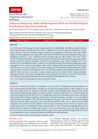 Dwi, Windu Kinanti Arti and Laily, Rahmah and Ismaya, Aria Sari and Annindya, May Annur and Ovie, Luksita Lathifa (2023) Edukasi kesehatan gigi-mulut melalui kegiatan UKGS dan UKGM di wilayah kerja Puskemas Purwoyoso Semarang. Jurnal Inovasi dan Pengabdian Masyarakat Indonesia, 2 (3): 14. pp. 58-62. ISSN 2829-5617