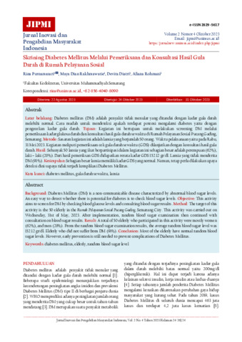 Rina, Purnamasari and Maya, Dian Rakhmawatie and Devita, Diatri and Afiana, Rohmani (2023) Skrining diabetes mellitus melalui pemeriksaan dan konsultasi hasil gula darah di rumah pelayanan sosial. Jurnal Inovasi dan Pengabdian Masyarakat Indonesia, 2 (4): 6. pp. 24-26. ISSN 2829-5617