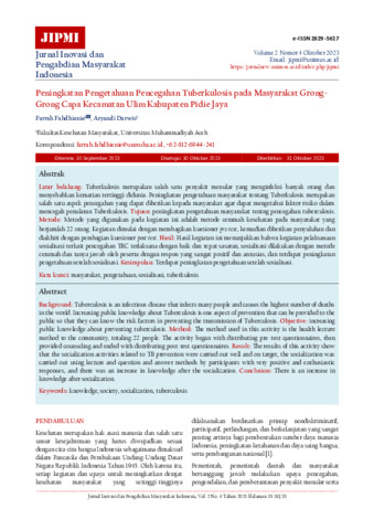 Farrah, Fahdhienie and Aryandi, Darwis (2023) Peningkatan pengetahuan pencegahan tuberkulosis pada masyarakat Grong-Grong Capa Kecamatan Ulim Kabupaten Pidie Jaya. Jurnal Inovasi dan Pengabdian Masyarakat Indonesia, 2 (4): 9. pp. 35-38. ISSN 2829-5617