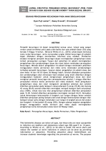 Dyan, Puji Lestari and Deasy, Erawati and Erismawati, Erismawati (2023) Edukasi pencegahan kecacingan pada anak sekolah dasar. Jurnal Kreativitas Pengabdian kepada Masyarakat, 6 (7): 30. pp. 2896-2915. ISSN 2615-0921