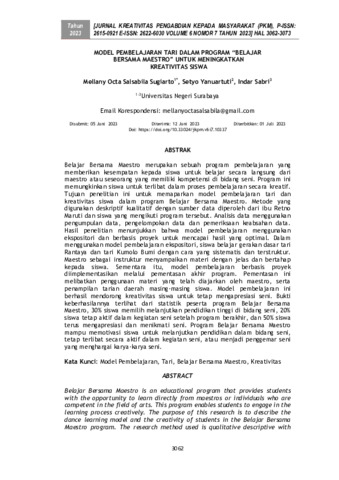 Mellany, Octa Salsabila Sugiarto and Setyo, Yanuartuti and Indar, Sabri (2023) Model pembelajaran tari dalam program “belajar bersama maestro” untuk meningkatkan kreativitas siswa. Jurnal Kreativitas Pengabdian kepada Masyarakat, 6 (7): 42. pp. 3062-3073. ISSN 2615-0921