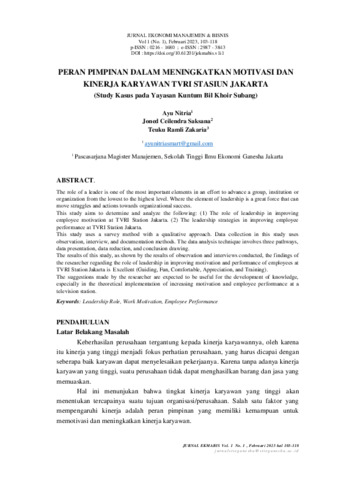 Ayu, Nitria and Joned, Ceilendra Saksana and Teuku, Ramli Zakaria (2023) Peran pimpinan dalam meningkatkan motivasi dan kinerja karyawan TVRI Stasiun Jakarta (Study kasus pada Yayasan Kuntum Bil Khoir Subang). Jurnal Sekolah Tinggi Ilmu Ekonomi Ganesha, 1 (1): 9. pp. 103-118. ISSN 0216-1680