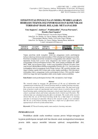 Toto, Sugiarto and Ambiyar, Ambiyar and Wakhinuddin, Wakhinuddin and Wawan, Purwanto and Hendra, Dani Saputra (2023) Efektivitas penggunaan media pembelajaran berbasis teknologi informasi dan komunikasi terhadap hasil belajar: Metaanalisis. EDUKASI: Jurnal Pendidikan, 21 (1): 10. pp. 128-142. ISSN 1829-8702