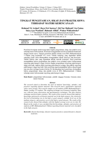 Rohmad, Tri Ardani and Bayu, Dwi Santoso and Siti, Nur Halimah and Ira, Fatma Satya Ayu Wardani and Rahmah, Afifah and Wahyu, Widiyatmoko (2023) Tingkat pengetahuan, sikap, dan praktik siswa terhadap materi kebencanaan. EDUKASI: Jurnal Pendidikan, 21 (1): 11. pp. 143-156. ISSN 1829-8702