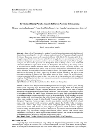 Melania, Lidwina Pandiangan and Fredy, Jhon Philip Sitorus and Hari, Nugraha and Agustinus, Agus Setiawan (2023) Revitalisasi ruang pustaka sejarah pahlawan nasional di Tangerang. Community of Urban Development, 1 (1): 3. pp. 18-26. ISSN 2986-8173