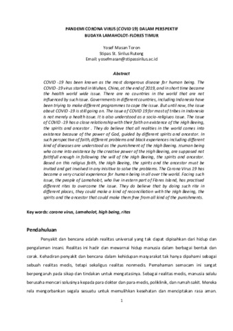 Yosef, Masan Toron (2022) Pandemi corona virus (COVID-19) dalam perspektif budaya Lamaholot - Flores Timur. Jurnal Alternatif Wacana Ilmiah Interkultural, 11 (1): 1. pp. 1-20. ISSN 2987-9485