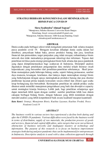 Siera, Syailendra and Ahmad, Sopyan (2023) Strategi berbasis konsumen dalam meningkatkan bisnis pasca COVID-19. Konsumen & Konsumsi : Jurnal Manajemen, 2 (2): 4. pp. 425-440. ISSN 2808-4667
