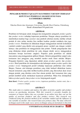 Afiana, Afiana (2023) Pengaruh product quality dan product review terhadap keputusan pembelian masker Sensi pada e-commerce Shopee. Konsumen & Konsumsi : Jurnal Manajemen, 2 (2): 2. pp. 387-404. ISSN 2808-4667