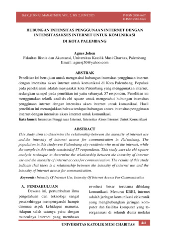 Agnes, Johen (2023) Hubungan intensitas penggunaan internet dengan intensitas akses internet untuk komunikasi di Kota Palembang. Konsumen & Konsumsi : Jurnal Manajemen, 2 (2): 5. pp. 441-449. ISSN 2808-4667
