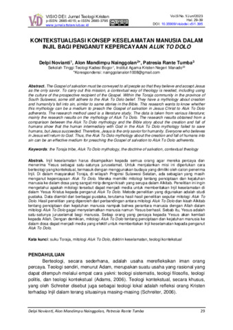 Delpi, Novianti and Alon, Mandimpu Nainggolan and Patresia, Rante Tumba (2023) Kontekstualisasi konsep keselamatan manusia dalam Injil bagi penganut kepercayaan Aluk To Dolo. Visio Dei: Jurnal Teologi Kristen, 5 (1): 3. pp. 29-39. ISSN 2685-4015