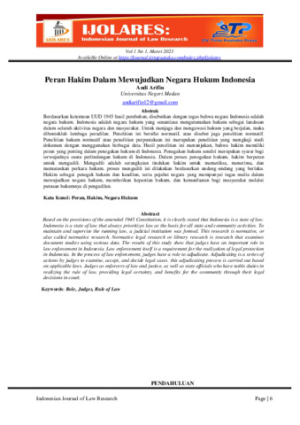 Andi, Arifin (2023) Peran hakim dalam mewujudkan negara hukum Indonesia. Indonesian Journal of Law Research, 1 (1): 2. pp. 6-10. ISSN 3025-1540