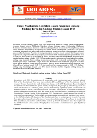 Rangga, Wijaya (2023) Fungsi Mahkamah Konstitusi dalam pengujian undang-undang terhadap Undang-Undang Dasar 1945. Indonesian Journal of Law Research, 1 (1): 5. pp. 23-27. ISSN 3025-1540