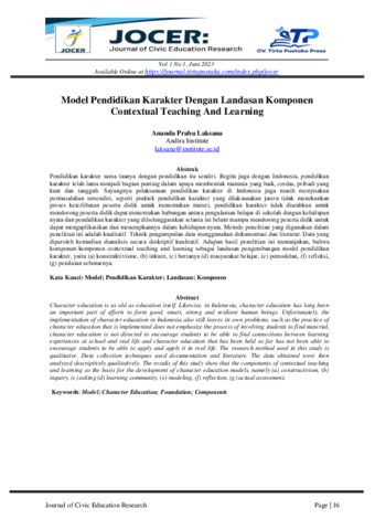 Ananda, Prabu Laksana (2023) Model pendidikan karakter dengan landasan komponen contextual teaching and learning. Journal of Civic Education Research, 1 (1): 4. pp. 16-23. ISSN 2988-7380