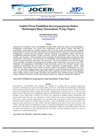 Karakteristik Nasionalisme yang melambangkan kekuatan suatu Negara dan asprasi yang berkelanjutan, kemakmuran, pemeliharaan rasa hormat dan penghargaan untuk hukum. Namun akhir-akhir ini nasionalisme warga Indonesia semakin menurun. Hal ini seiring dengan permasalahan yang dihadapi bangsa Indonesia. Berbagai masalah yang dihadapi oleh Bangsa Indonesia mulai dari masalah kemiskinan, pengangguran, terorisme dan lain sebagainya. Metode penelitian yang digunakan dalam penelitian ini menggunakan pendekatan kualitatif dengan penelitian deskriptif berdasarkan studi kasus dan telaah pustaka yang bertujuan untuk mengalisis peran pendidikan kewarganegaraan dalam membangun sikap nasionalisme warga negara. Hasil penelitian ini menunjukan, bahwa pendidikan kewarganegaraan erat kaitannya dengan nilai-nilai nasionalisme dan patriotisme. Hal tersebut bukanlah mitos, karena memang secara substantif pendidikan kewarganegaraan bertujuan untuk membentuk warga negara yang baik. Pendidikan Kewarganegaraan dimaksudkan untuk membentuk peserta didik menjadi manusia yang memiliki rasa kebangsaan dan cinta tanah air. Tujuan pendidikan kewarganegaraan adalah untuk menciptakan warga Negara yang memiliki wawasan mengenai kenegaraan, menanamkan rasa cinta tanah air, dan merasa bangga sebagai warga Negara Indonesia. Untuk membangun nasionalisme generasi muda sebagai wujud pendidikan kewarganegaraan adalah ungkapan perasaan senasib sepenanggungan dalam lingkup bangsa dalam bentuk kepedulian dan kepekaan akan masalah-masalah yang dihadapi bangsa, termasuk di dalamnya masalah yang berkaitan dengan rasa solidaritas sebangsa dan setanah air.