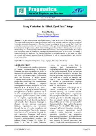 Frans, Marthen (2023) Slang variations in “Black Eyed Peas” songs. Pragmatica: Journal of Linguistics and Literature, 1 (1): 4. pp. 30-38. ISSN 2988-7410